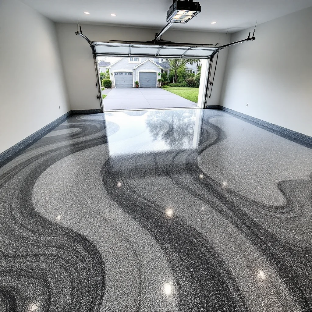 Stunning 3D metallic swirl designs using premium UV-stable pigments. Each floor is unique with flowing patterns that catch light beautifully.